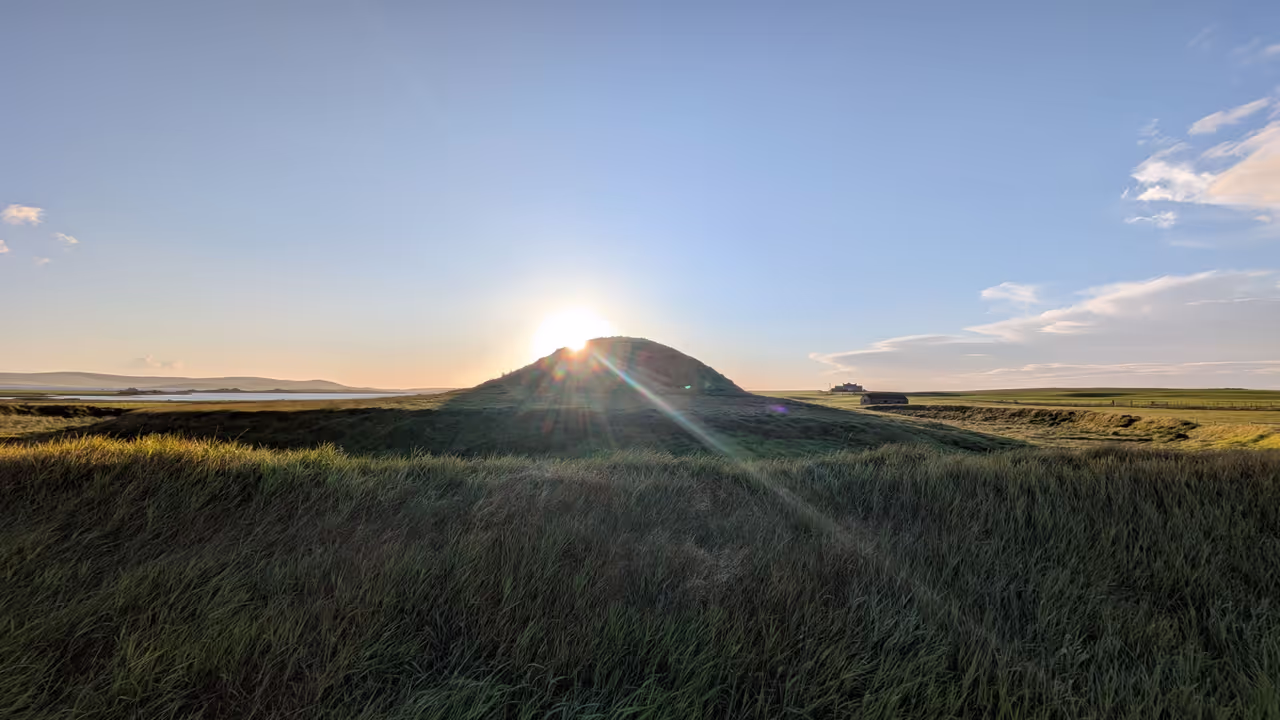 Just ten minutes after driving off the ferry at Stromness I’m standing on top of Maeshowe looking at one of the most awe-inspiring prehistoric landscapes in the world. Caroline made the mistake of letting me choose what we’re doing this evening, so she’s sitting in the van reading while I’ve jumped over one gate and another barbed-wire fence to scale this twenty-four-foot high Neolithic burial chamber. My smart mauve trousers are splattered in mud and the cows in the field are making a hell of a din, spooked by my intrusion. But I’m beyond excited to be here.